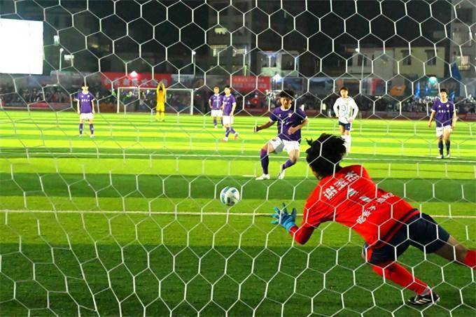 (江永队门将扑向新田队射来的点球。高源鑫摄)